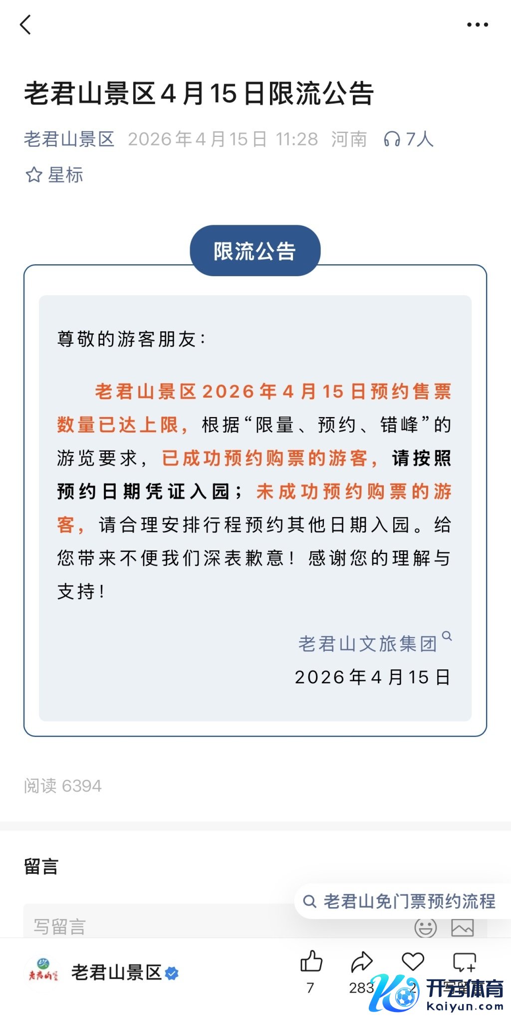 4月15日,一个“平平无奇”的职责日,中午11:28,老君山景区发布限流公告称,景区预约售票数目已达上限,根据“限量、预约、错峰”的游览条目,已得胜预约购票的搭客可按照预约日历证明入园;未得胜预约购票的搭客预约其他日历入园。