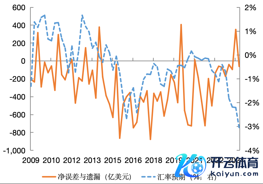 图3 2009年以来中国“净差错与遗漏”季度值与东谈主民币汇率预期