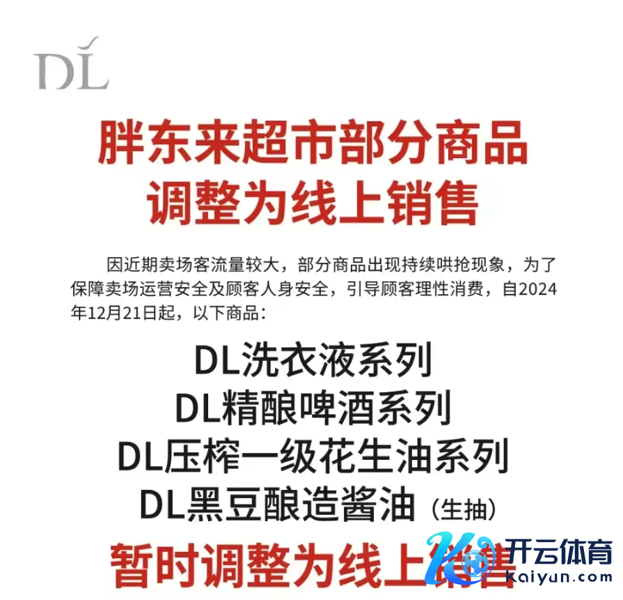 公告本体闪现,因近期胖东来卖场客流量较大,部分商品出现捏续哄抢时事,为了保险卖场运营安全及顾来宾身安全,指令主顾感性奢华,自2024年12月21日起,DL洗衣液系列、DL精酿啤酒系列、DL压榨一级花生油系列、DL黑豆酿造酱油(生抽)暂时转变为线上销售。
