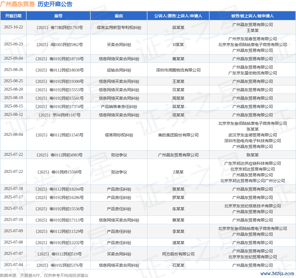 案号:(2025)京04民终1187号审理法院:北京市第四中级东说念主民法院案由:信息聚集买卖左券纠纷当事东说念主信息: 原告/上诉东说念主:项某某 被告/被上诉东说念主:广州晶东买卖有限公司开庭日历:2025年8月12日笔据统计,近一年内以广州晶东买卖有限公司为当事东说念主的历史开庭公告有140则,其中案由为“信息聚集买卖左券纠纷”的公告以49则居首,其次为“买卖左券纠纷”有26则,“居品背负纠纷”有22则。历史开庭公告(前20条)如下: