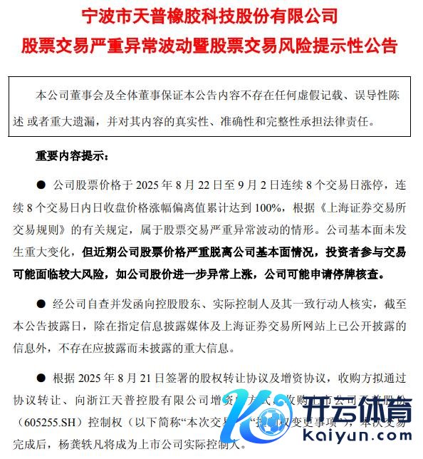 天普股份发布股票走动严重相配波动暨股票走动风险指示性公告称,公司股票价钱和洽8个走动日涨停,和洽8个走动日内日收盘价钱涨幅偏离值累计达到100%,证明《上海证券走动所走动公法》的相干法例,属于股票走动严重相配波动的情形。公司基本面未发生过失变化,但近期公司股票价钱严重脱离公司基本面情况,投资者参与走动可能靠近较大风险,如公司股价进一步相配高潮,公司可能苦求停牌核查。