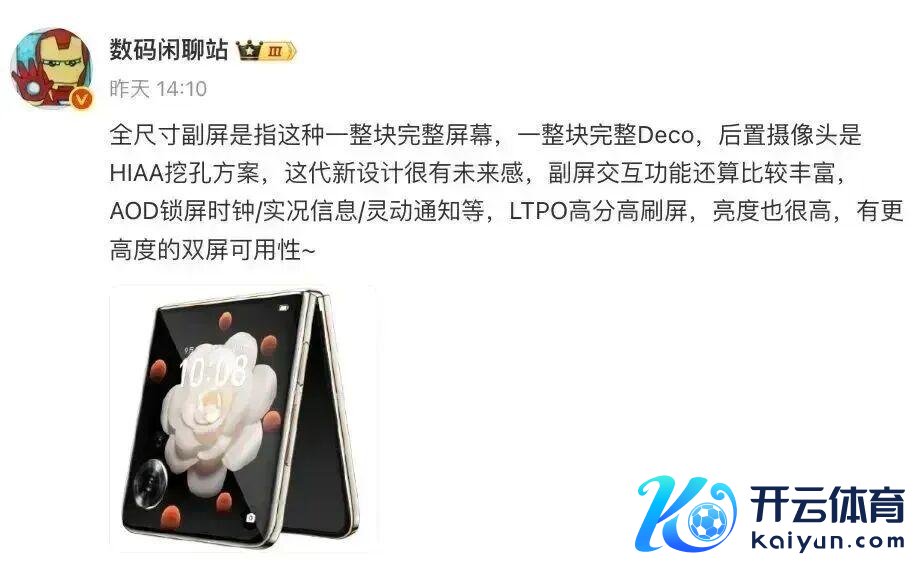 此前爆料则透露,其配备的是全尺寸副屏,即一整块完好屏幕,一整块完好Deco,后置录像头是HIAA挖孔决策,副屏交互功能相比丰富,AOD锁屏时钟/实况信息/灵动见告等,LTPO高分高刷屏,亮度也很高,有更高度的双屏可用性。
