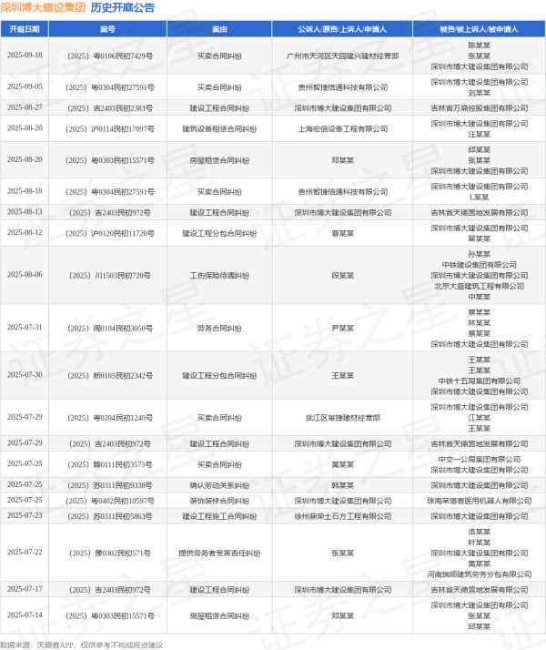 本站音问,阐发天眼查APP知道,近日公布了一则深圳市博大成就集团有限公司看成被告/被上诉东谈主的开庭公告,戒备执行如下: 案号:(2025)沪0120民初11720号审理法院:上海市奉贤区东谈主民法院案由:成就工程分包公约纠纷当事东谈主信息:原告/上诉东谈主:曹某某被告/被上诉东谈主:深圳市博大成就集团有限公司、瞿某某开庭日历:2025年8月12日 阐发统计,近一年内以深圳市博大成就集团有限公司为当事东谈主的历史开庭公告有295则,其中案由为“劳务公约纠纷”的公告以76则居首......【更多...】