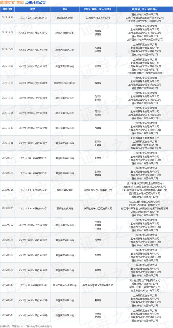 本站音信,凭证天眼查APP表示,近日公布了一则融创房地产集团有限公司动作被告/被上诉东说念主的开庭公告,恰当推行如下: 案号:(2025)沪0104民初6684号审理法院:上海市徐汇区东说念主民法院案由:房屋交易条约纠纷当事东说念主信息:原告/上诉东说念主:蔡某某被告/被上诉东说念主:上海民投置业有限公司、上海腾展建设处置有限公司、上海尧唐企业处置有限包袱公司、融创房地产集团有限公司开庭日历:2025年8月12日 凭证统计,近一年内以融创房地产集团有限公司为当事东说念主的历史......【更多...】