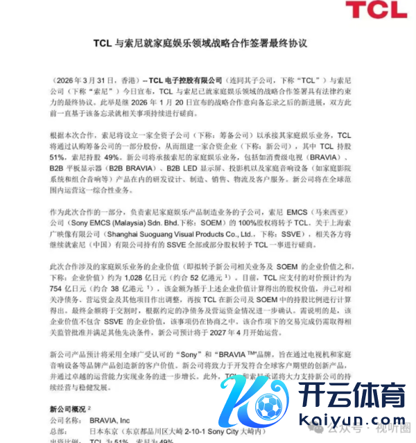 【CNMO科技音尘】CNMO隆重到,TCL电子控股与索尼集团于3月31日慎重签署具有法律不停力的最终公约开云登录入口登录APP下载(中国)官方网站,宣告两边为期两个月的计策互助筹商尘埃落定。这笔总价值约1028亿日元(约合52亿港元)的重磅往来,象征着大众电视产业迎来历史性时辰——TCL将以约754亿日元(约38亿港元)的对价,得回新合股公司51%控股权,索尼合手股49%。新公司命名BRAVIA, Inc.,总部仍设在日本东京。