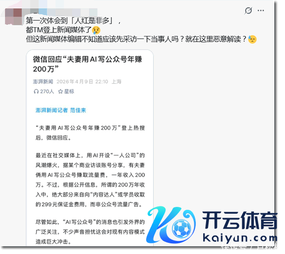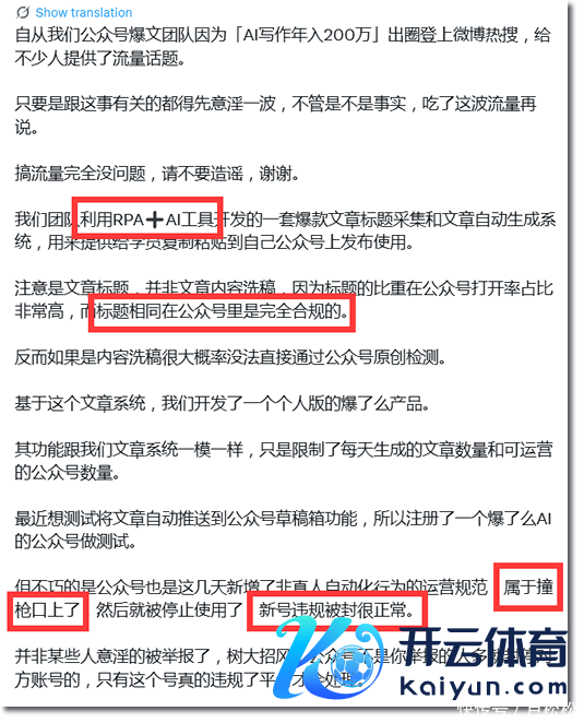 是以才有了微信的回话:微信公众平台一贯饱读吹真东说念主创作。也有新轨则:公众号和劳动号不得诈骗AI、剧本、接口或其他自动化方法,替代真东说念主完成内容创作、发布等经过,也不得传播、推行此类自动化创作的教程或劳动。